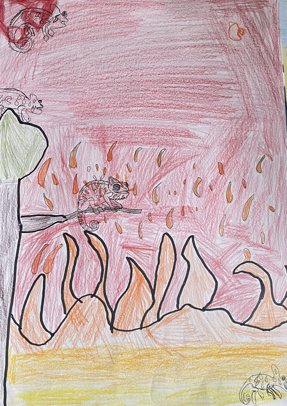 Les élèves doivent cacher le caméléon présent sur la feuille donnée. Sans le recouvrir totalement mais par le décor, les formes, les couleurs…