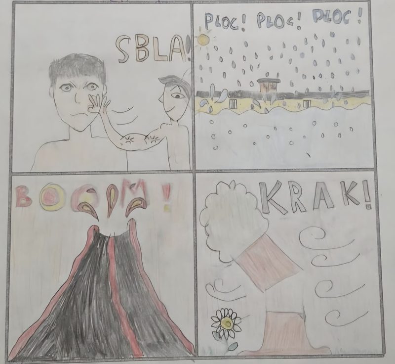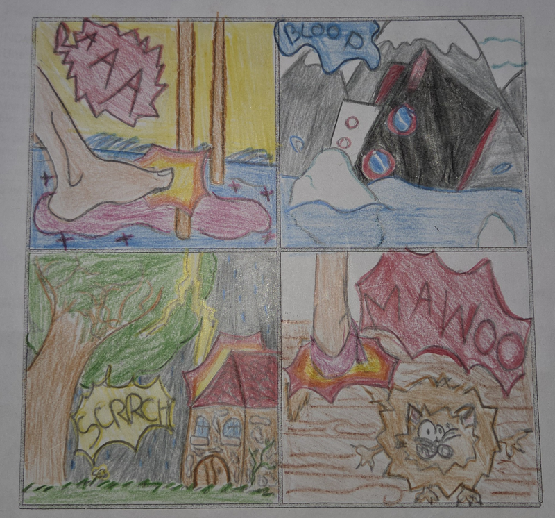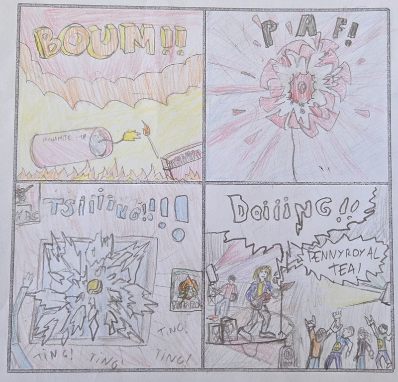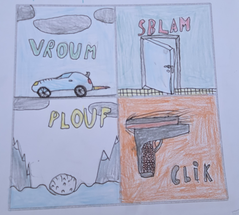 Travail sur les onomatopées, d'abord en dessin puis en collage avec un léger relief.