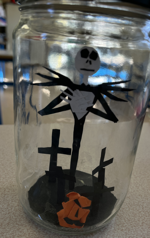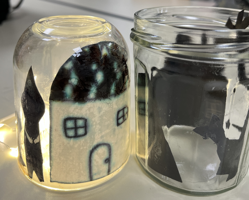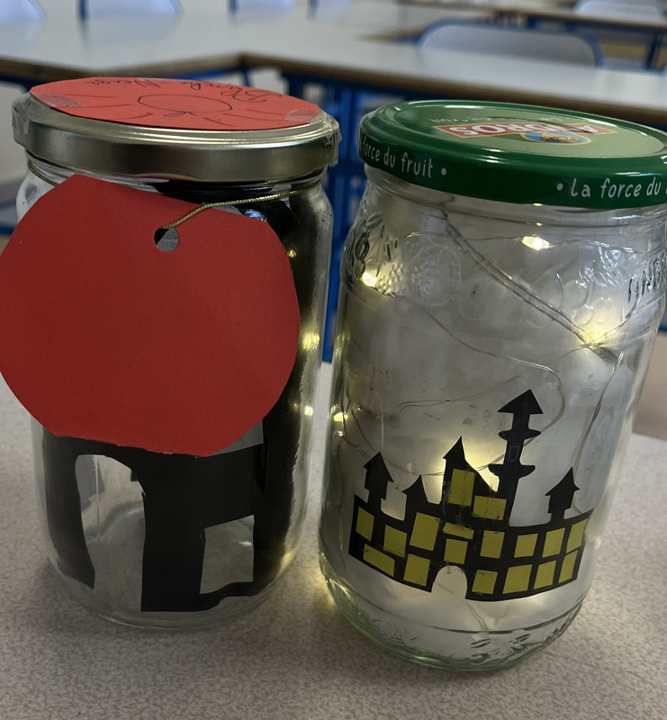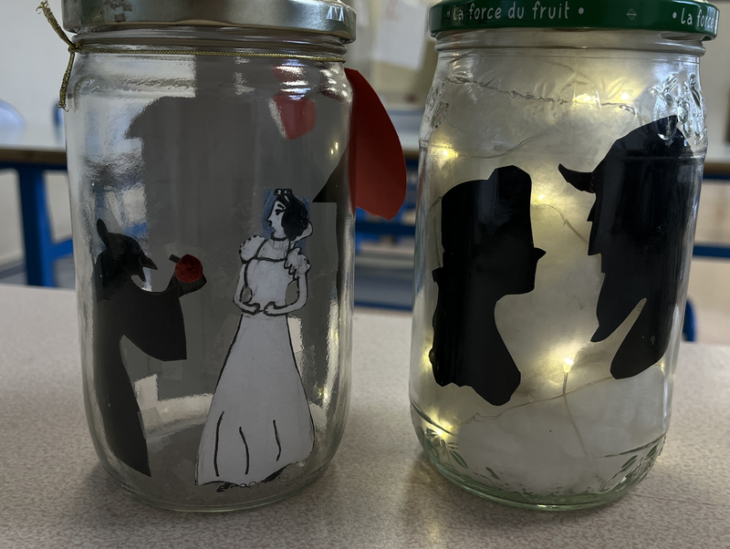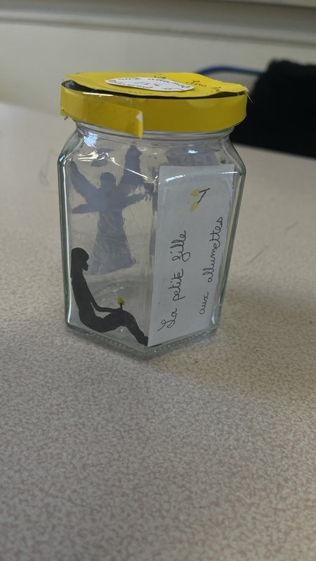 Décembre /janvier: Dans ce projet les élèves ont travaillé sur le conte et ont dû réaliser la prouesse d’illustrer une scène d’un conte célèbre à l’intérieur d’un pôt/bocal. Avec une contrainte: la taille et la forme mais aussi la technique du découpage/collage.