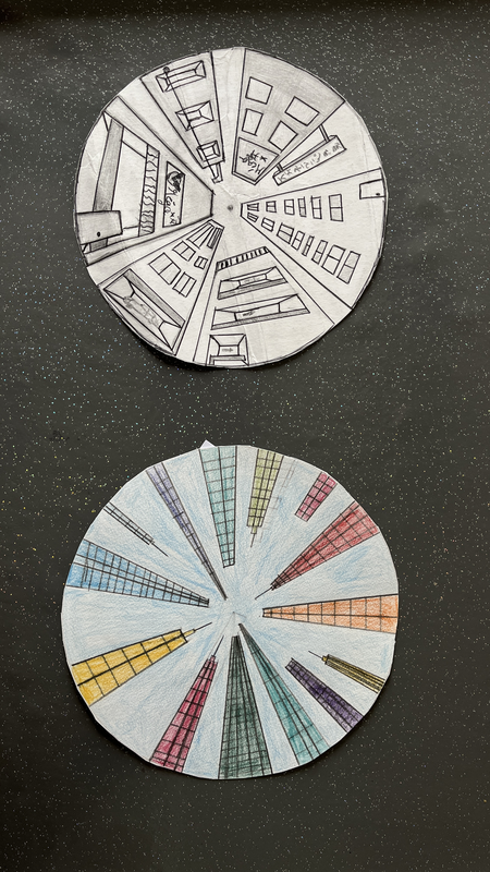 Travail sur la perspective à 1 point de fuite, vue en contre-plongée à l’intérieur d’un cercle.